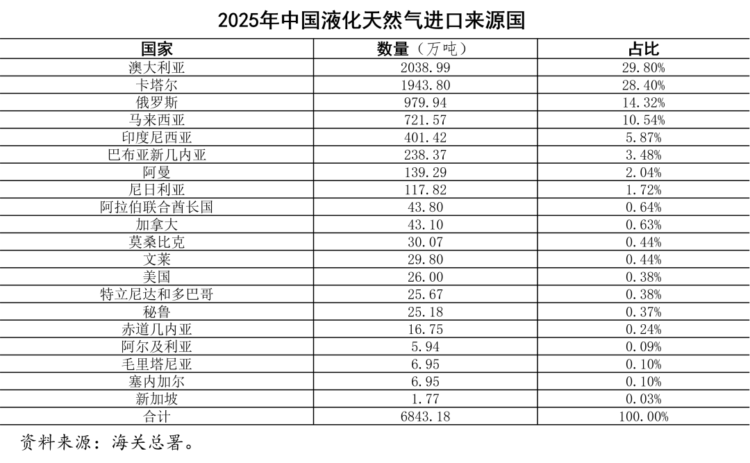 2025年,我国进口液化天然气(LNG)6843.183万吨,比上年减少10.72%;金额为2537亿元。2025年,我国共从20个国家进口液化天然气,其中澳大利亚第一,为2038.986万吨,占比29.80%,金额为744.34亿元;卡塔尔第二,为1943.797万吨,占比28.40%,金额为713.71亿元;俄罗斯第三,为979.942万吨,占比14.32%,金额为355.83亿元;马来西亚第三,为721.57万吨,占比10.54%,金额为247.13亿元。