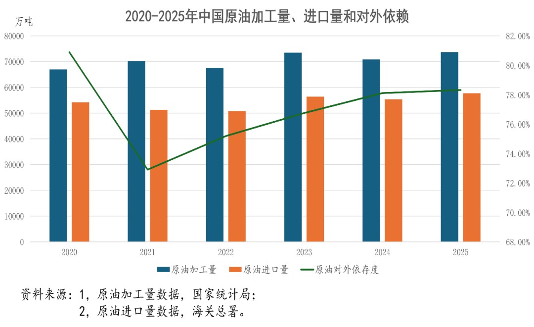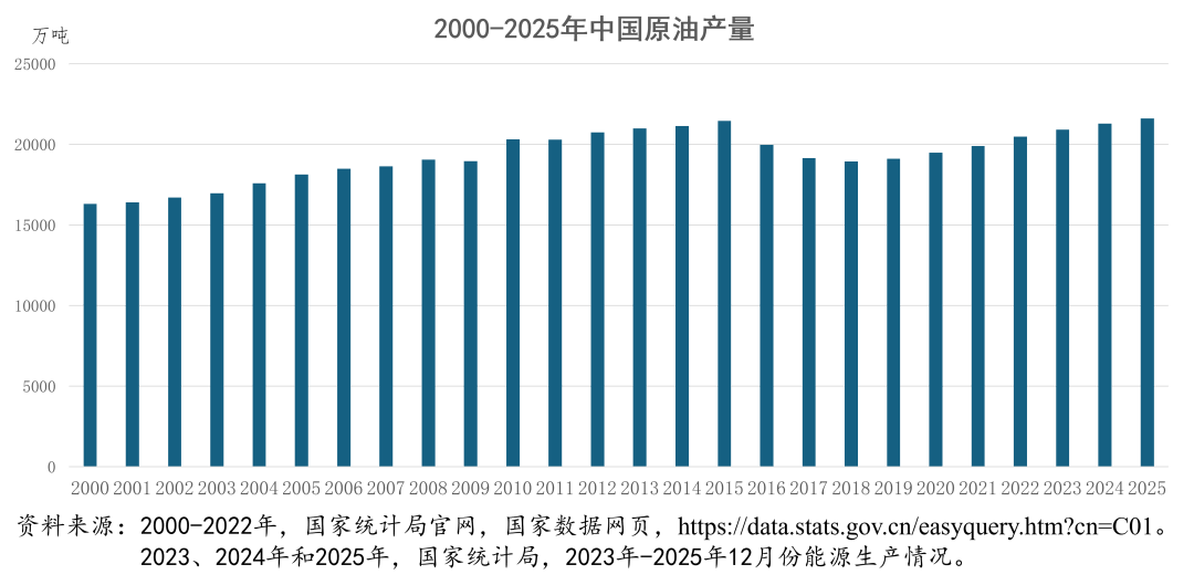 根据国家统计局2026年1月19日发布的数据,2025年,我国规上工业原油产量21605万吨,同比增长1.5%;规上工业原油加工量73759万吨,同比增长4.1%。