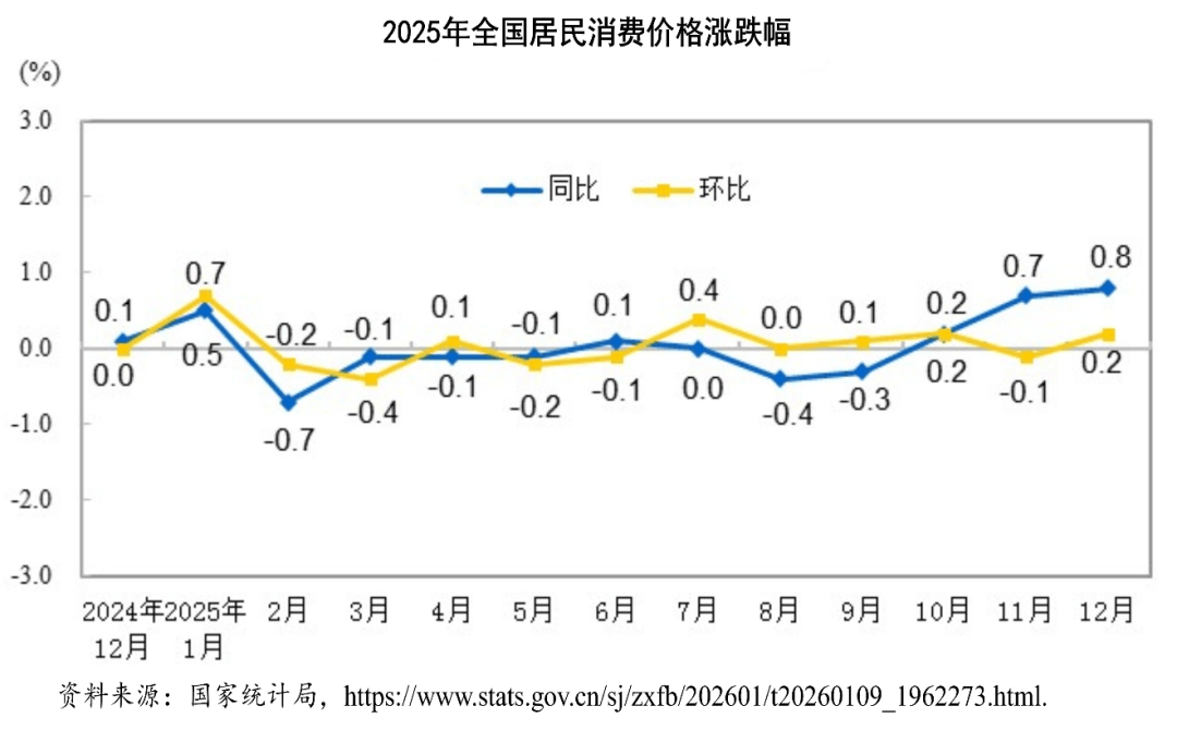 根据国家统计局2026年1月9日公布的数据,2025年全年,全国居民消费价格与上年持平,12月份全国居民消费价格同比上涨0.8%。其中,城市上涨0.9%,农村上涨0.6%;食品价格上涨1.1%,非食品价格上涨0.8%;消费品价格上涨1.0%,服务价格上涨0.6%。