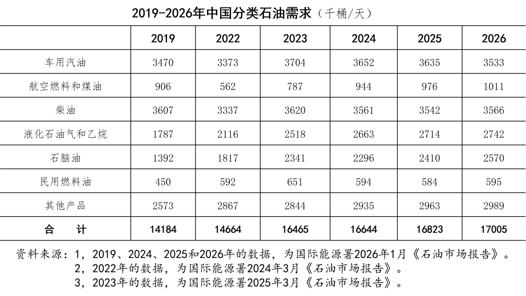 国际能源署每月出版的《石油市场报告》,有有关中国石油消费和成品油消费的数据。根据2024年3月、2025年3月的《石油市场报告》(其中2022年、2023年的数据分别为最新的数据)和2026年1月的《石油市场报告》,2019年以来的我国成品油需求数据如“2019-2026年中国分类石油需求”表所示。